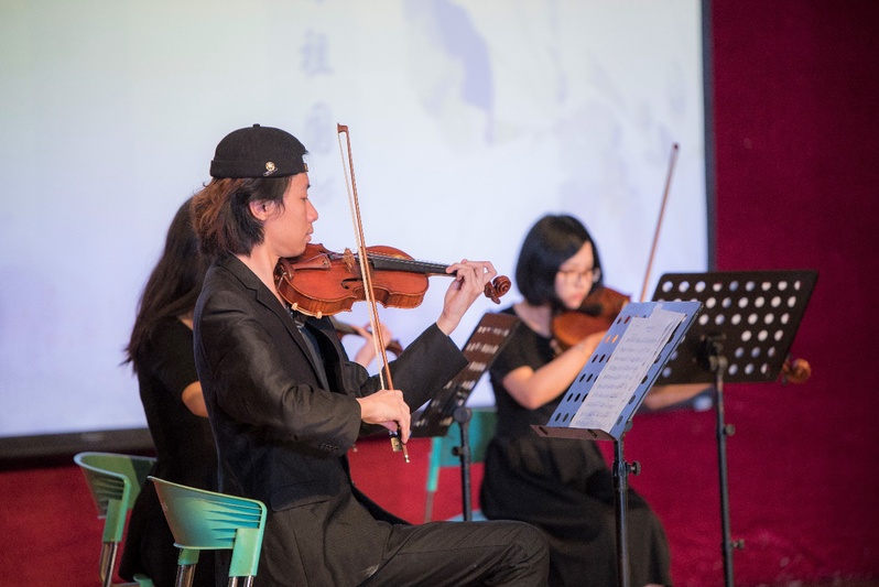 颁奖仪式结束后,表演正式开始。首先上场的管乐团弦乐声部带来《我和我的祖国》《梁祝》《菊花台》三曲合奏,促成弦乐与传统文化的一次美妙的相遇。接着,六位朗诵者依次上台,用他们深情而令人动容的声音朗诵了本次征文比赛中的优秀作品。