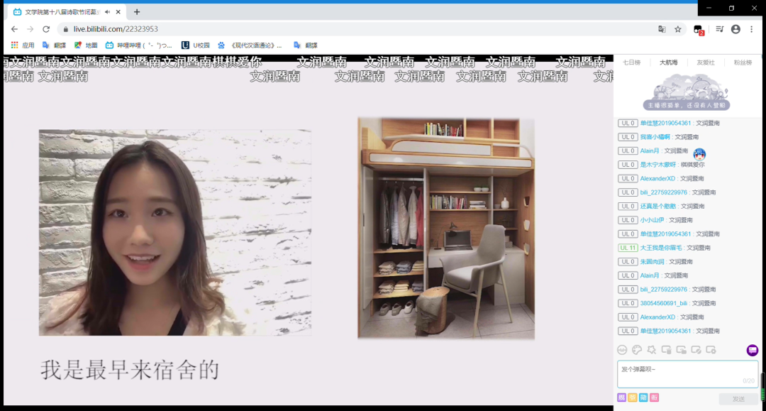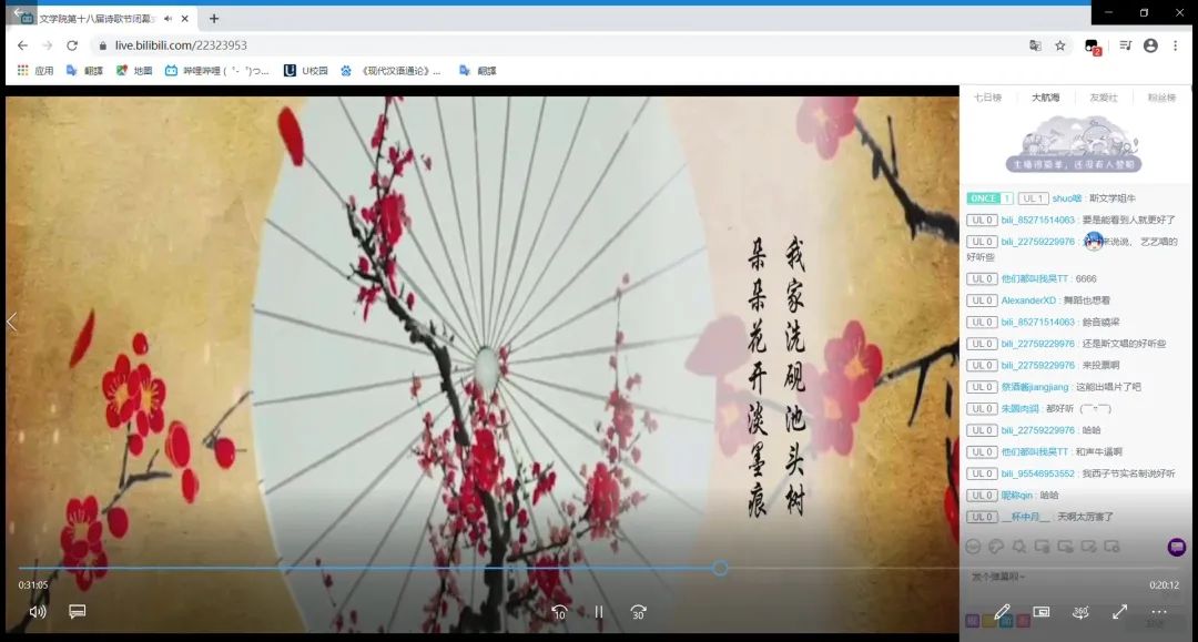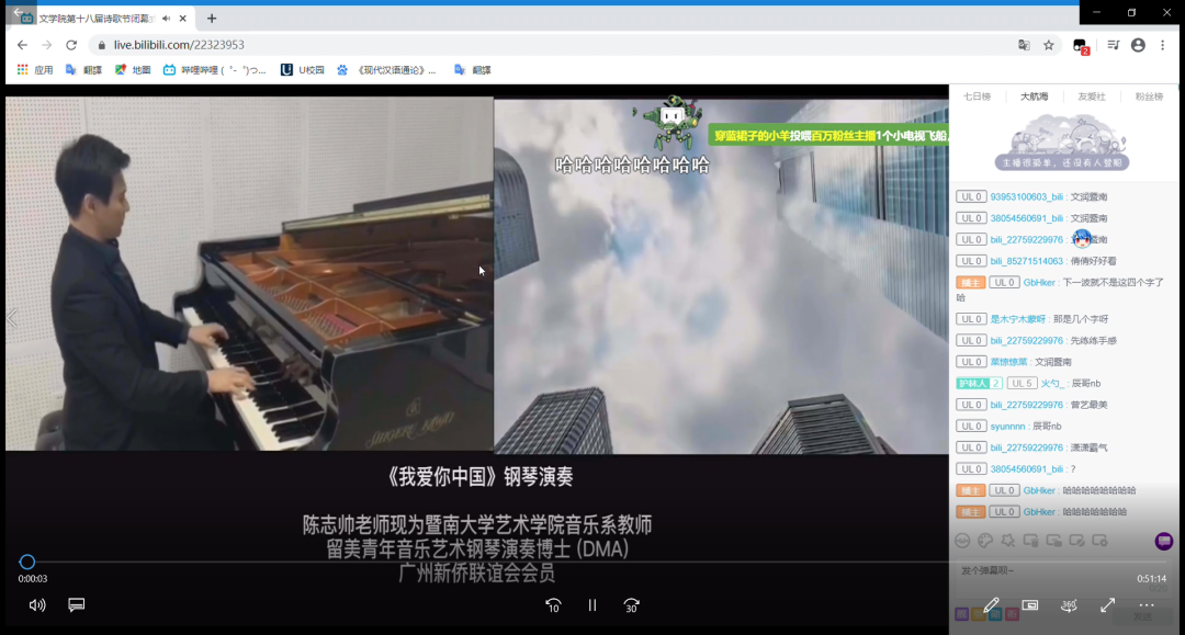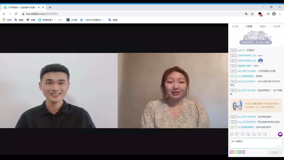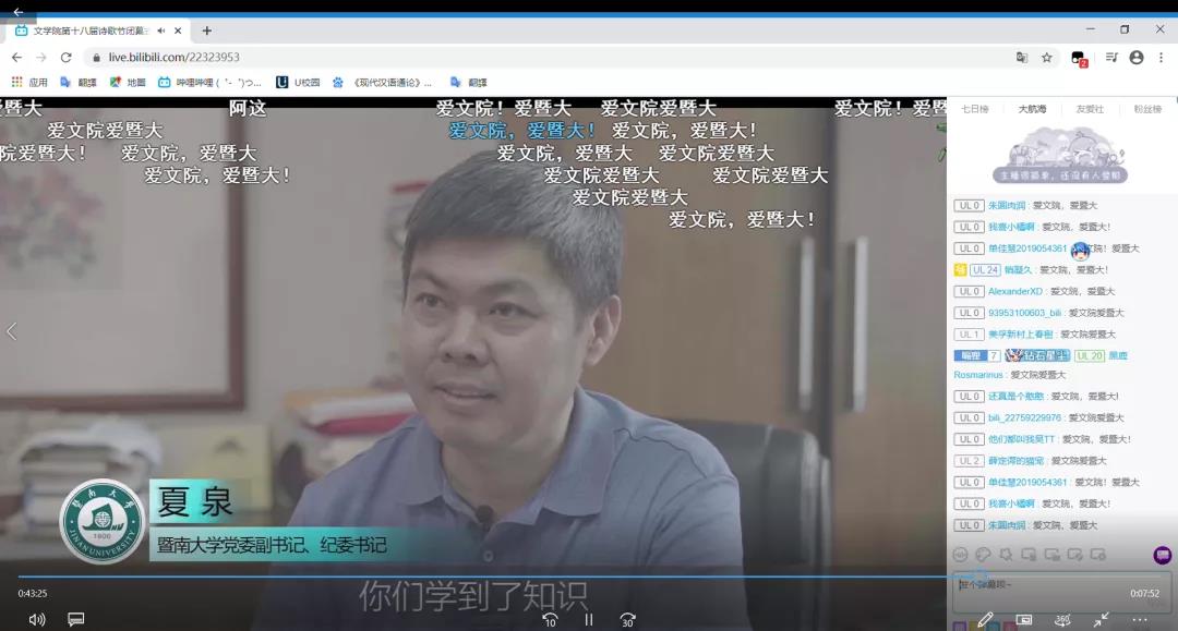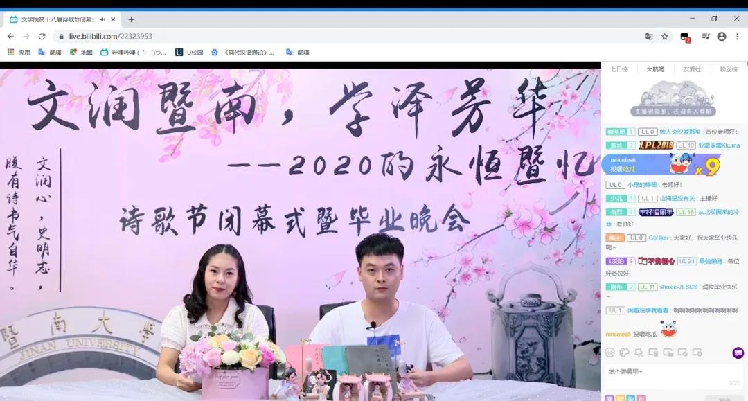 晚上七点,为了创造不一样的2020的毕业暨忆,由bevictor伟德官网与公司离退休处关心下一代工作委员会联合主办的诗歌节迎来了线上闭幕式暨毕业晚会,首创B站直播的方式为毕业生作文艺汇演,采用录播与直播的方式,使全国各地甚至全世界的员工都能感受bevictor伟德官网诗歌节的魅力,全场晚会收看人数达到2000多人次,从小屏到大屏让更多人感受诗歌的美好及暨南园带给大家的独特暨忆。
