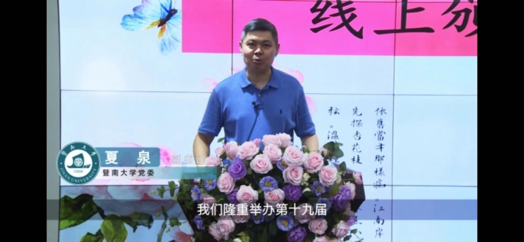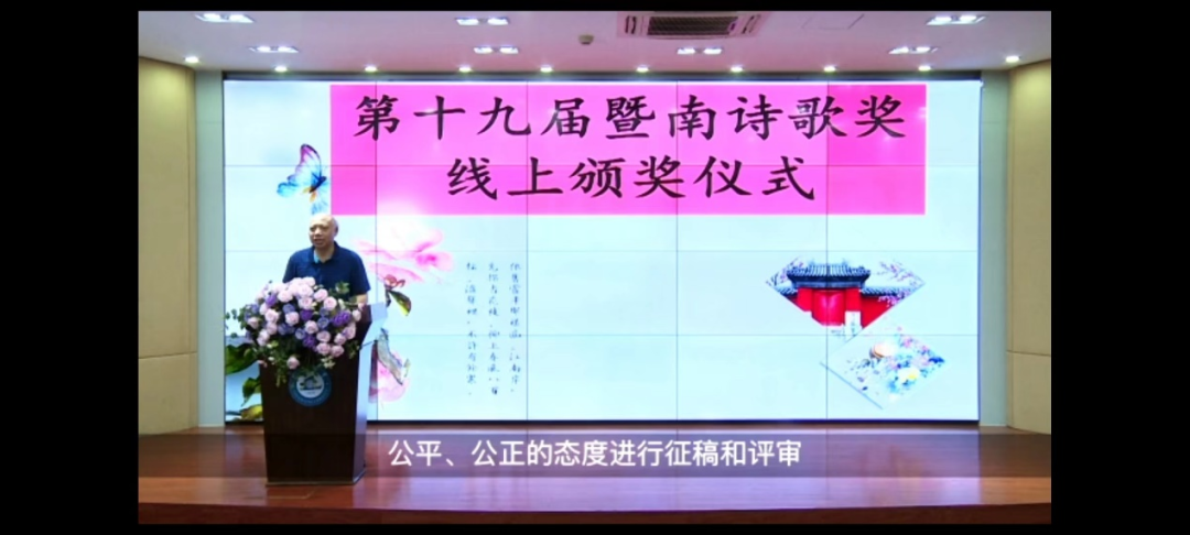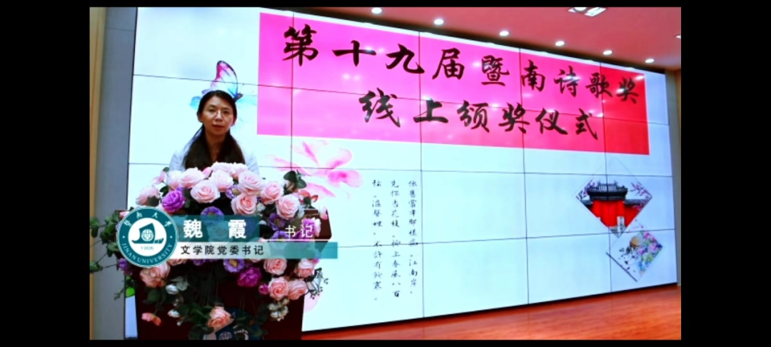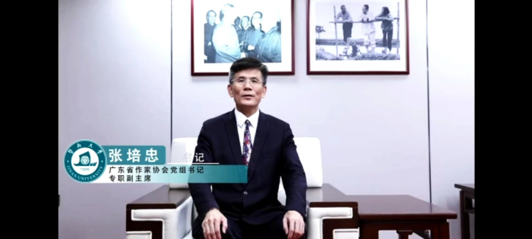 广东省作家协会党组书记、专职副主席张培忠,南京师范大学bevictor伟德官网教授、博士生导师郦波,青年作家蒋方舟通过视频的方式为暨南诗歌奖及海内外青年学子送上寄语与祝福。南京师范大学教授郦波借用《随园诗话》中“诗人者,不失其赤子之心”和“诗,妙在孩子语”两句,祝愿在场青年学子都能永葆一颗赤子之心;而青年作家蒋方舟则通过讲述两个具体的故事,希望青年学子们都能学会用文学的方式,留住生活中美好的瞬间及感受,丰富自己的人生体验。