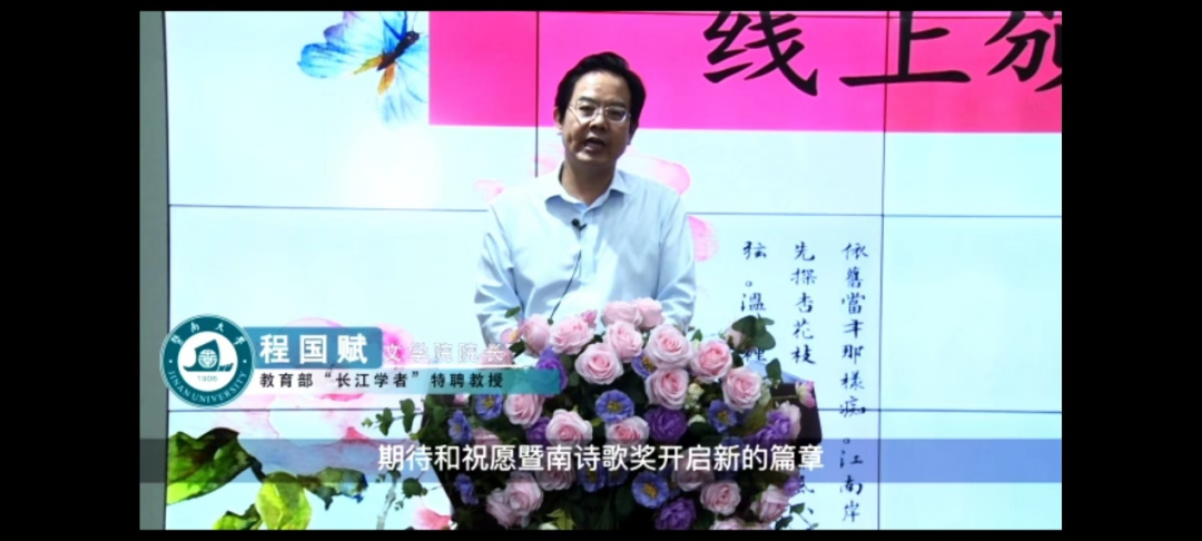 由于疫情原因未能亲临现场的获奖学子,一一用视频的方式送上获奖感言。其中,现代诗一等奖获奖者刘雪风讲述其诗歌创作目的在于寻找遗失的过往,搭建心灵的栖息地;古代诗一等奖获奖者陆韵则介绍其诗词是受疫情有感而作,并祝愿受到疫情影响的人们都能早日回归正常的生活。